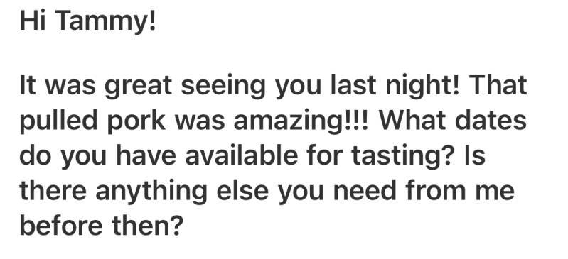 We can't wait for you guys to cater our wedding in October
