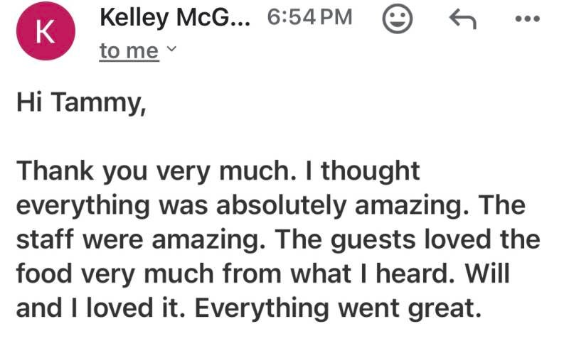 Thank you so much Tammy and her staff for a phenomenal food and service. We opted for a backyard wedding due to the pandemic. the catering team was professional and courteous. They followed all health guide lines. the appetizers and buffet selections were all amazing! All our guests were very happy and impressed with the huge selection. They took care of everything and we didn't have to do a thing. Thank you so much for helping to make our special day so memorable and perfect!