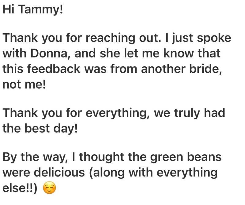 Tammy was amazing at my wedding! The food was amazing! Tammy made sure we ate and didn't miss cocktail hour. She did an amazing job at our wedding and we truly couldn't have been more happy with our choice of choosing them! If you want a down to earth caterer definitely choose them.